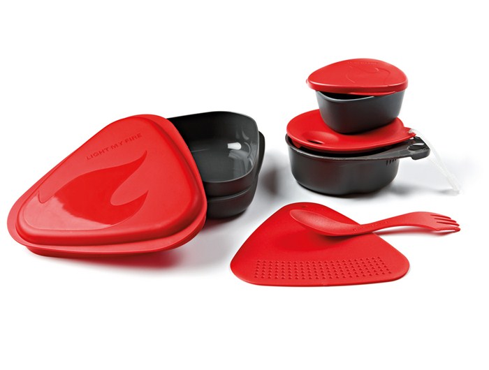 Light My Free, ünlü bir İsveç markası. Bu mutfak seti de en önemli ürünlerinden biri. 2 Tabak, bir kesme tahtası ve süzgeç, bir çatal/kaşık ve bir bardaktan oluşan kitin ağırlığı 312 gram. Tüm malzemeler tabak içinde toplanabiliyor ve o nedenle de fazla yer kaplamıyor. Tabaklardan biri (kapak olan) oldukça sığ, bu nedenle içinde sıvı bir yemek mümkün değil. Alt tabak ise oldukça derin. Çatal ve kaşık bana ergonomik gelmedi. Onun dışında set gayet kullanışlı. Özellikle de kampçılar için.