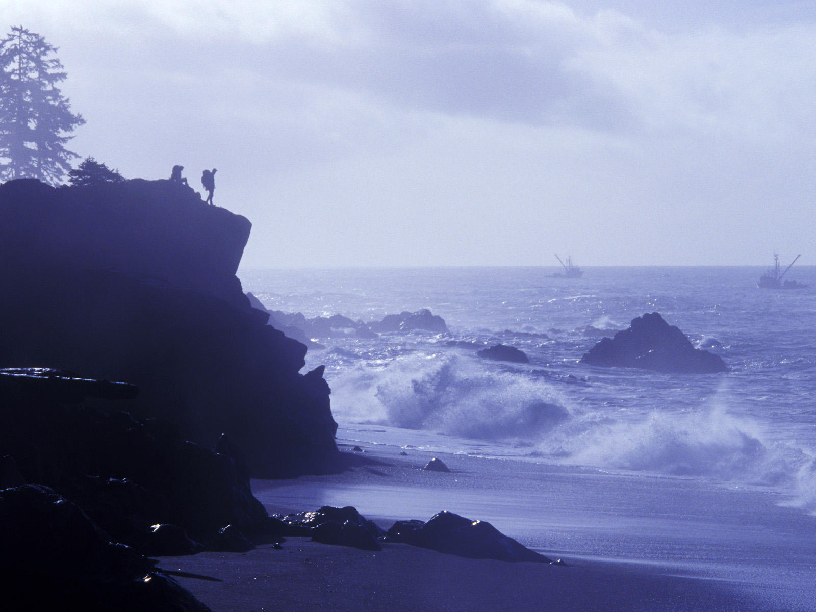 Hikers on Rock ledge, West Coast Trail, Pacific Rim National Park, Vancouver Island, British Columbia, Canada
