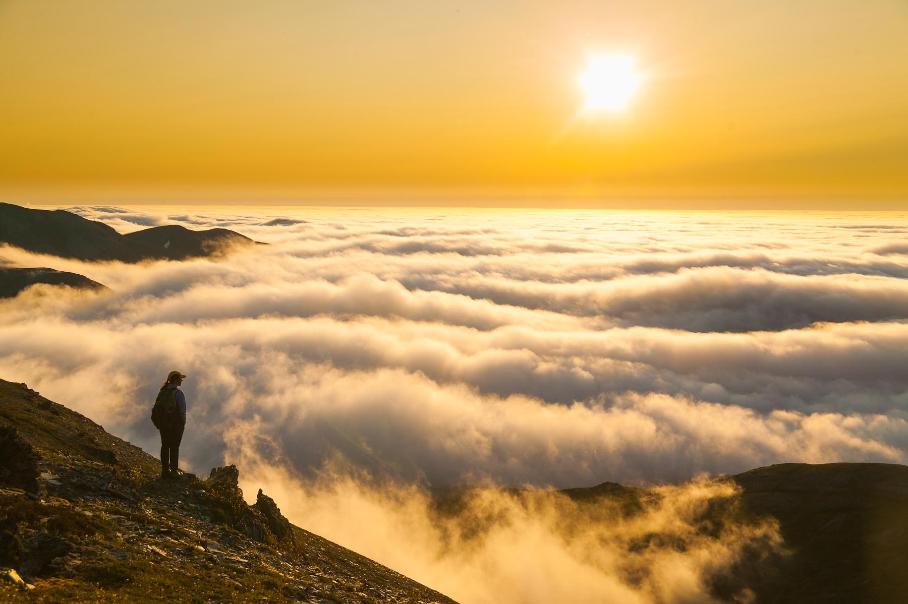 Hiker watching midnight sun above Kongakut River coastal plain above stratus clouds from the Arctic Ocean, Arctic National Wildlife Refuge, Brooks Range, Alaska